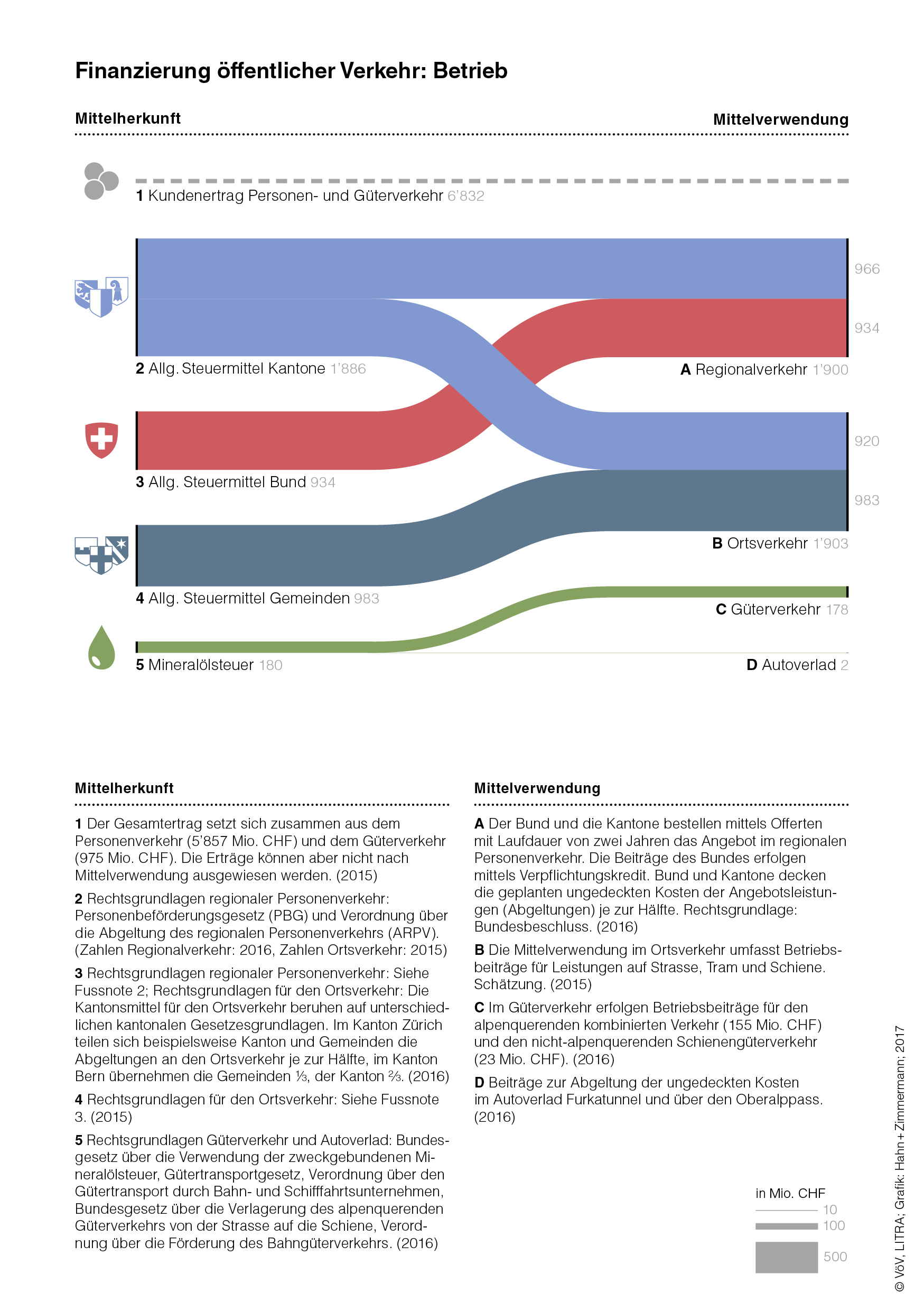 Die Finanzierung des öffentlichen Verkehrs ist sehr komplex. Neben den Erlösen aus dem Billettverkauf fliessen Gelder der öffentlichen Hand in den öV. Ziel der vorliegenden Grafik ist die transparente und verständliche Darstellung der Geldflüsse von Bund, Kantone und Gemeinden in den öV. |